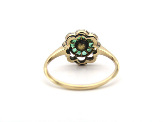 9K gold Edwardian pearl, emerald, and diamond flower ring, circa 1905.